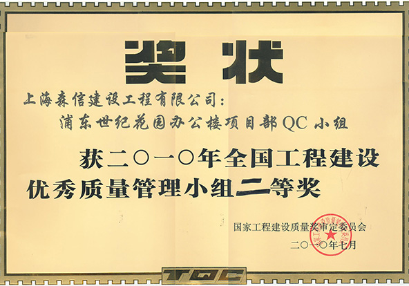 2010年東上海三期QC小組榮獲全國工程建筑優(yōu)秀質(zhì)量管理小組二等獎