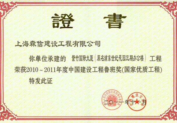 2011年11月紫竹國際大廈(浦東世紀(jì)花園辦公樓)項目榮獲中國建設(shè)工程魯班獎